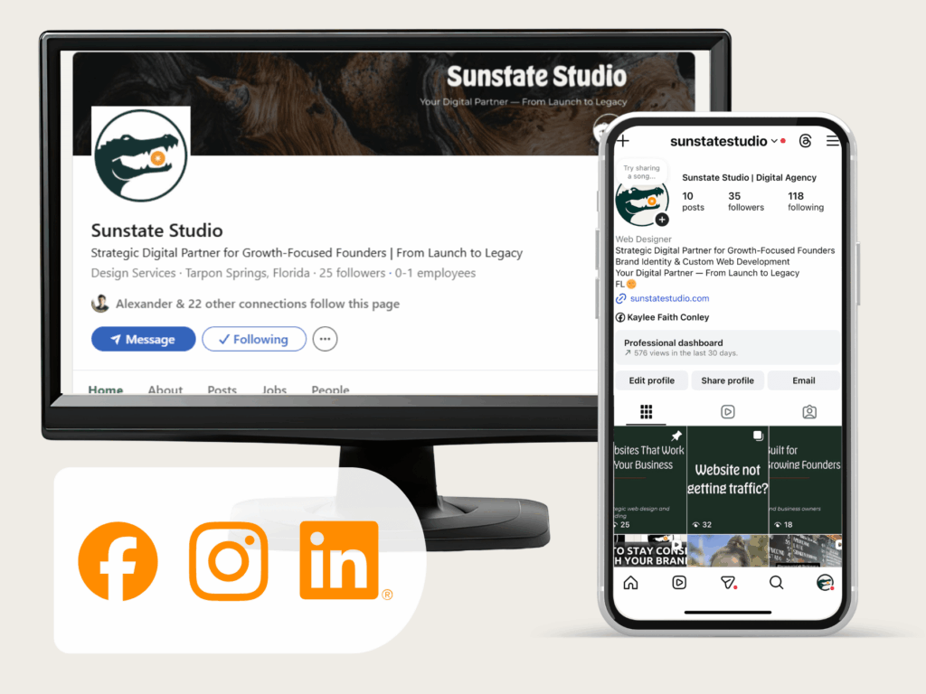 Sunstate Studio aligns your website, visuals, and social presence so your brand feels intentional and unified across platforms. Full-scope projects include strategic social media setup and brand-aligned post templates designed to provide direction and cohesion without creating long-term dependency.